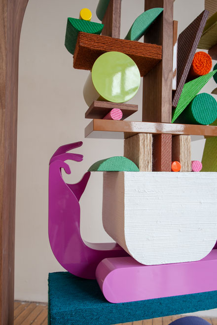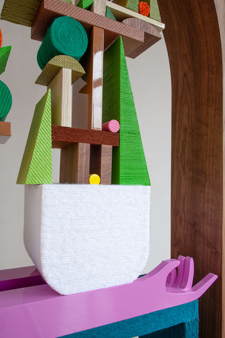 Within his watercolors on paper, an ongoing conflict between these two forces is depicted. Framed by a traditional archway, disembodied, exquisite limbs squirm and gesture; defiling the carefully appointed and balanced domestic interiors, which are accented by incense burners, house plants and pottery. Born from these watercolors, Bogia’s sculptures suggest furniture and decor in both scale and surface. Lacquer finishes, walnut veneer, grass cloth wallpaper, and folksy hand-laid yarn mixed with ornamental objects, conjure an abstraction of a specifically urbane kind of domestic interior. The modern comfort and beauty expressed in these works is precarious: the sculptures are precisely designed to be held together by only balance and tension, suggesting that even private personal utopias are fragile and easily disrupted.