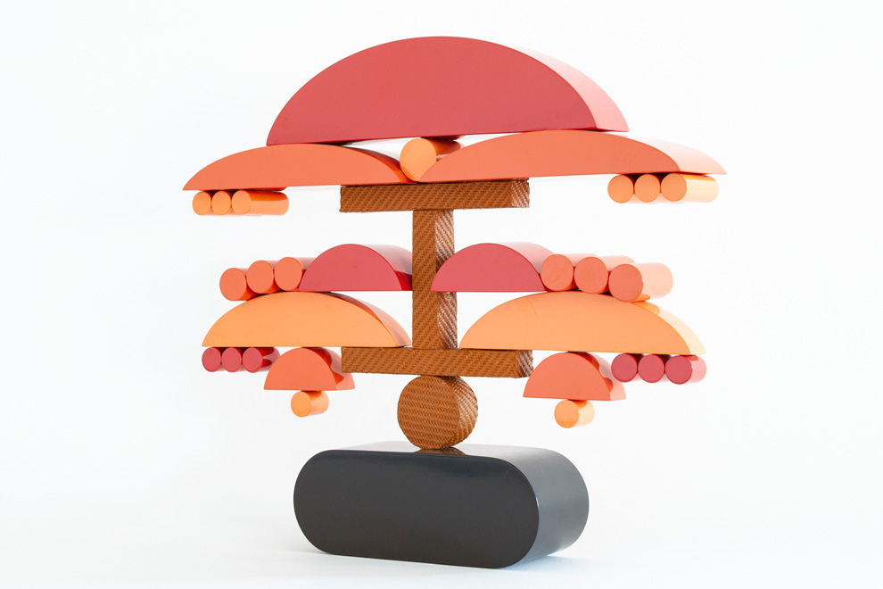 Bogia’s newest body of work focuses on the bonsai as a projection of an alternative, calmer reality; one crafted through meticulous exertion and care. With these works, Bogia also seeks to reference the home, and the tension that exists within domestic spaces. Bogia’s bonsai sculptures are treated with surface finishes ranging from lacquer to grass-cloth wallpaper, materials which accentuate the interior quality of the works. They are a veneer of visual delight, distracting us from what chaos surely exists elsewhere. To keep a bonsai is a frenetic balancing act, and a potentially all-encompassing one. Bonsais are meticulously sculpted into idealized versions of natural forms; and in Bogia’s hands, they become metaphors for the body, which can likewise be molded – though, unlike these particular bonsai, never made static.