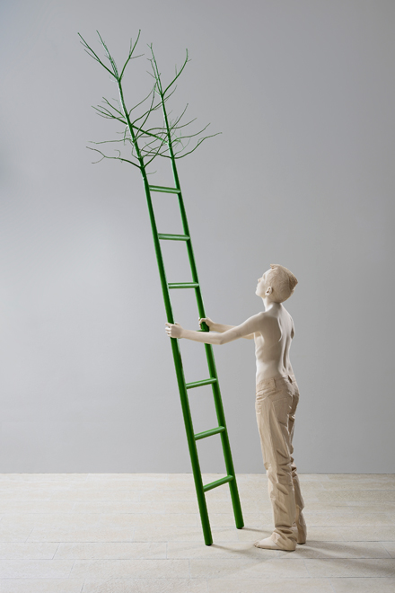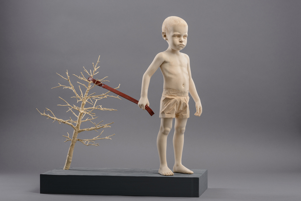 The subject chosen by the sculptor is the human figure, or rather, the human figure in its relations with other forms of life, with animals, nature, trees, or with various objects of the world. The material used is limetree wood, which is left smooth and covered in details by brilliant and unexpectedly applied acrylic paint. The titles of the works are funny and ironic. With respect to the long and high tradition of the Dolomites, Verginer remains loyal to the skill and precision of wood carving, while introducing modern, new and personal subject matter.
