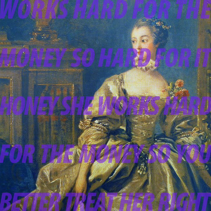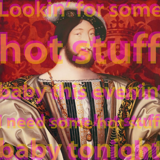 Ken Aptekar uses the history of art, primarily classical painting, as his lexicon to bring the past into the present, activating painting to create a dialogue with contemporary viewers. To this end, Aptekar appropriates images from existing works, then transforms the composition, color, and scale, often radically. He links these new interpretations to the original historical sources to express their relevance today. Associations to the images are inscribed boldly floating over the surface of the historic source painting, a form of concrete poetry, inviting the viewer to consider what they are looking at in the context of today’s more familiar world. Sometimes humorous, always dissonant, the effect is powerful, and often reverberates in viewers’ experiences contemplating other historical works.