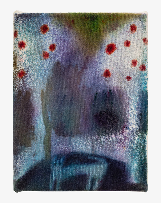 Spirits, mystical faces, glowing flames and human figures emerge from Erdrich’s deep color fields, and the blurred interlay of pigments mixed with water result in images that softly come in and out of focus. Often working on both sides of the muslin before stretching it, Erdrich’s washes penetrate the fabric resulting in unexpected patterns and markings, and reverse-bleed images that further heighten the dreamy aspect of her paintings. There is an abstract and spiritual feeling to the cast of characters quietly addressing us from within her canvases, all subsumed by deep-hued clouds and haze.