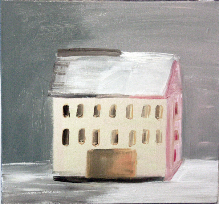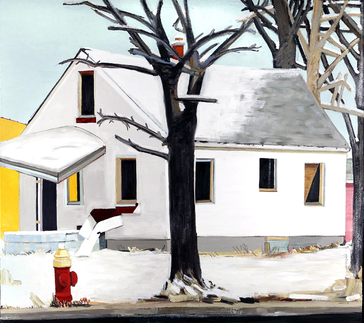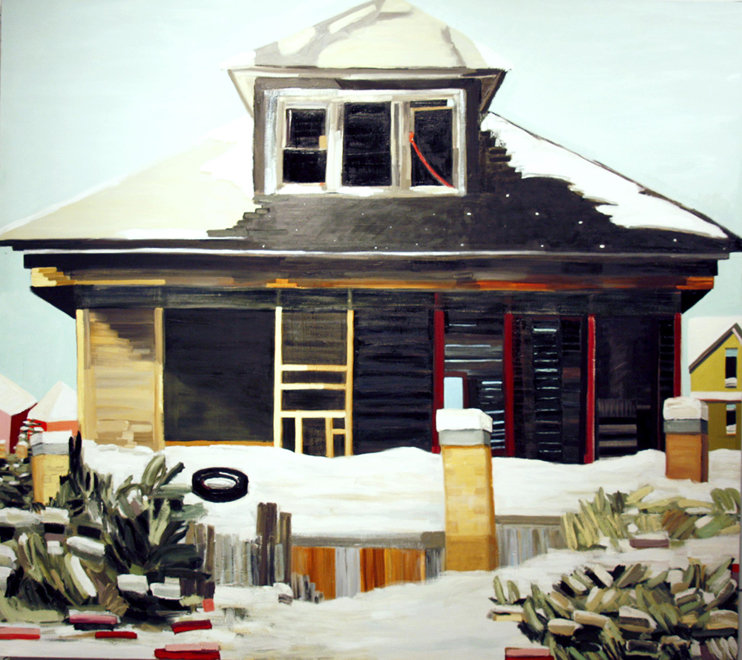 My current work is subject driven. The new paintings depict disintegrating houses, and small industrial buildings, that stand as monuments to their former communities. Though politically relevant, this body of work (“Detroit: dismantling cities in Middle America”) is a love-poem to abandoned neighborhoods. I honor this decay, through seeing these structures clear– they are oddly bright and strong – a shell of a house, an old bakery building, luminous illogical color lingering on a surprising wall.   A house that looks better without it’s roof.  The corner garage painted blue to show someone cares. The sky has changed from the absence of industry. There is a kind of fullness in the emptiness, and a cloying kind of joy in the decay: it’s the contradictions that make energy and grace.