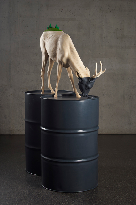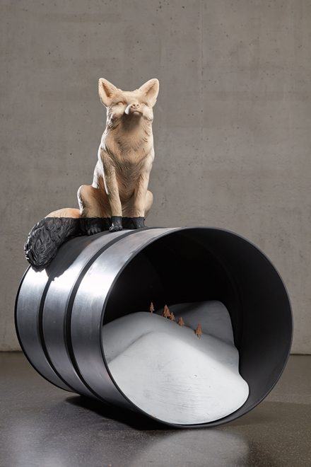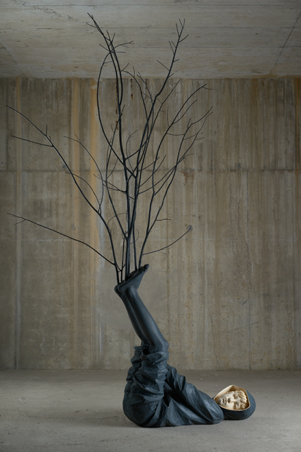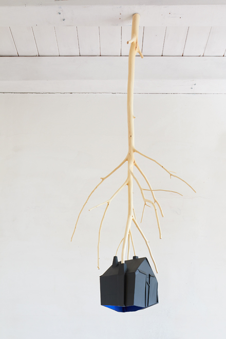 Verginer took a further step in the direction of indecipherability between 2010 and 2013 with his In hoc signo series. His sculpted figures, now even more enigmatically mute, are displayed as mises en scène: young girls with marmoreal faces or young boys with child-like features accompanied by incongruous objects such as light bulbs covered in gold leaf, drawers or cups filled with natural motifs like leaves and flowers. Willy Verginer’s latest work has returned to the sense of all-powerful nature. We feel the force of the landscapes of his childhood. The tree is now centre stage. For Verginer, the tree is not just a basic element of man’s natural habitat but the leaven of modern city living. Narration has completely disappeared. Any perceptible aspects of reality are so juxtaposed as to heighten the overall surrealist effect. With his large houses, we step right into a new concept of space merely glimpsed in his previous In hoc signo series.